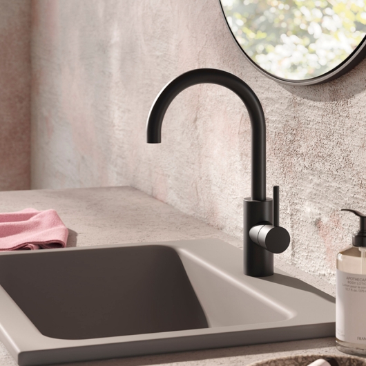 ![]() | 18.020320.1.12 DEEP BLACK Waschtisch-Einlochbatterie L-Size mit seitlicher Betätigung ohne Ablaufgarnitur Montage mit und ohne Zierring möglich Auslauf schwenkbar 360° LOGIC-SoftEmotion-Keramikkartusche SSR-Perlator mit beweglicher Strahlscheibe LOGIC-FiX-Befestigung Ausladung 175 mm Höhe Auslaufunterkante 214 mm Anschlussschläuche / DVGW zertifiziert erforderliche Lochbohrung 35 mm Oberfläche Schwarz matt UVP 492,00 € zzgl. MwSt.