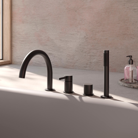 ![]() | 18.022025.1.12 DEEP BLACK Vierloch-Wannenarmatur für Fliesen- oder Wannenrandmontage mit starrem Wannenauslauf LOGIC-SoftEmotion-Keramikkartusche Neoperl-Perlator mechanischer Drehumsteller ausziehbare Stabhandbrause Nylon-Brauseschlauch eigensicher gegen Rückfließen inklusive Befestigungsmaterial Ausladung 231 mm Höhe Auslaufunterkante 93 mm erforderliche Lochbohrungen 35 mm Oberfläche Schwarz matt UVP 1.087,00 € zzgl. MwSt.
