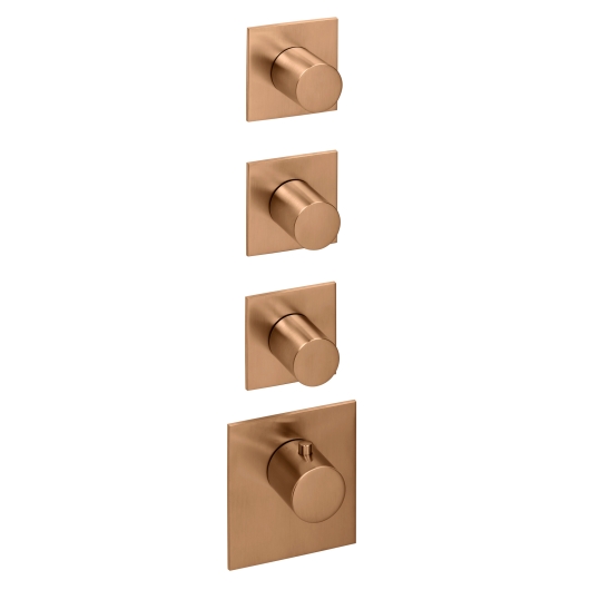 ![]() | 21.523010.1.39 LOGIC XL 3 Farbset Endmontageset zum Aufsatz auf LOGIC XL 3 Thermostat Einbaukörper für 3 Verbraucher Ventilblenden eckig 70 mm x 70 mm Thermostatblende eckig 110 mm x 100 mm Bediengriffe rund Oberfläche Edelstahl PVD Copper Steel UVP 1.573,00 € zzgl. MwSt.