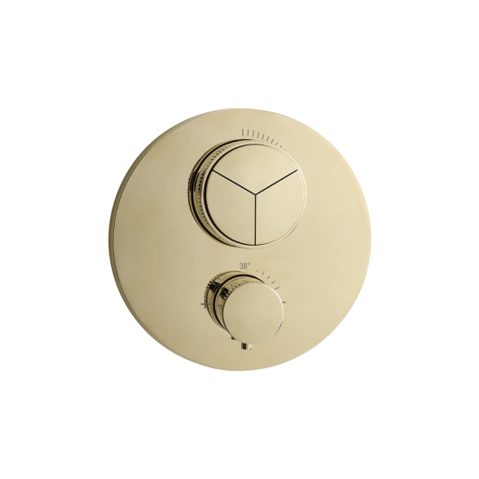 ![]() | 30.803055.1.03 LIVING PUSH Thermostat Farbset Endmontageset zum Aufsatz auf LOGIC PLUS-Box 11.110000.1.09 für 3 Verbraucher Ein- und Ausschalten der 3 Verbraucher über Push-Button Durchflussmenge stufenlos mit Reguliergriff einstellbar LOGIC-Thermostatkartusche Heißwassersperre 38°C eigensicher gegen Rückfließen Bediengriffe rund Blende rund Ø 150 mm Blendenhöhe 15,5 mm DVGW DW-6512DN0759 Oberfläche PVD Gold UVP 1.174,00 € zzgl. MwSt.