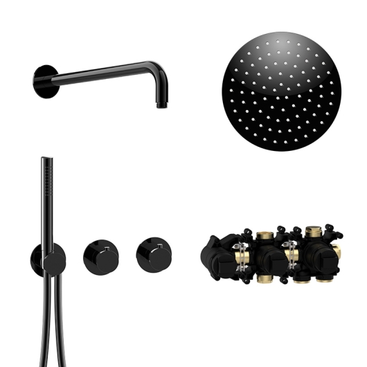 ![]() | 70.702711.1.08 MODUL7 Thermostat-Set T-RB250 mit Regenbrause und Stabhandbrause 70.720001.1.09 MODUL7 Thermostat-Einbaukörper - für 2 Verbraucher - Einbautoleranz 60 - 90 mm 70.702001.1.08 MODUL7 Thermostat-Farbset für 2 Verbraucher - drehbare Thermostatkartusche zur Regelung des Temperaturbereichs von 20°C-55°C - manuell entriegelbare Heißwassersperre bei 38°C als Verbrühschutz - keramischer 2 Wege-Umsteller - leichtgängige und stufenlose Mengenregulierung mit geringem Bedienradius - Brauseanschlussbogen mit verdecktem Schlauchanschluss - MODUL7-Brauseschlauch 1500 mm mit Drehkonus - 1-strahlige Messing-Stabhandbrause - Messing Bediengriffe - Messing Modulblenden Ø 70 mm 11.960350.1.08 LIVING SPA Wandarm 350 mm - Messingblende Ø 70 mm 11.600250.1.08 LIVING SPA Slim-Regenbrause Ø 250 mm - mit Clean-Effect Oberfläche PVD Absolute Black UVP 2.060,00 € zzgl. MwSt.