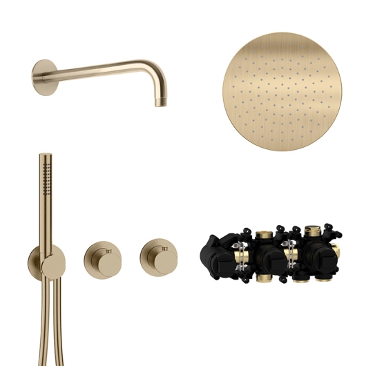 ![]() | 70.702711.1.41 MODUL7 Thermostat-Set T-RB250 mit Regenbrause und Stabhandbrause 70.720001.1.09 MODUL7 Thermostat-Einbaukörper - für 2 Verbraucher - Einbautoleranz 60 - 90 mm 70.702001.1.41 MODUL7 Thermostat-Farbset für 2 Verbraucher - drehbare Thermostatkartusche zur Regelung des Temperaturbereichs von 20°C-55°C - manuell entriegelbare Heißwassersperre bei 38°C als Verbrühschutz - keramischer 2 Wege-Umsteller - leichtgängige und stufenlose Mengenregulierung mit geringem Bedienradius - Brauseanschlussbogen mit verdecktem Schlauchanschluss - MODUL7-Brauseschlauch 1500 mm mit Drehkonus - 1-strahlige Messing-Stabhandbrause - Edelstahl Bediengriffe - Edelstahl Modulblende Ø 70 mm 21.960350.1.41 LIVING SPA Wandarm 350 mm - Edelstahlblende Ø 70 mm 11.600250.1.41 LIVING SPA Regenbrause Ø 250 mm - mit Clean-Effect Oberfläche PVD Brass Steel UVP 3.126,00 € zzgl. MwSt.