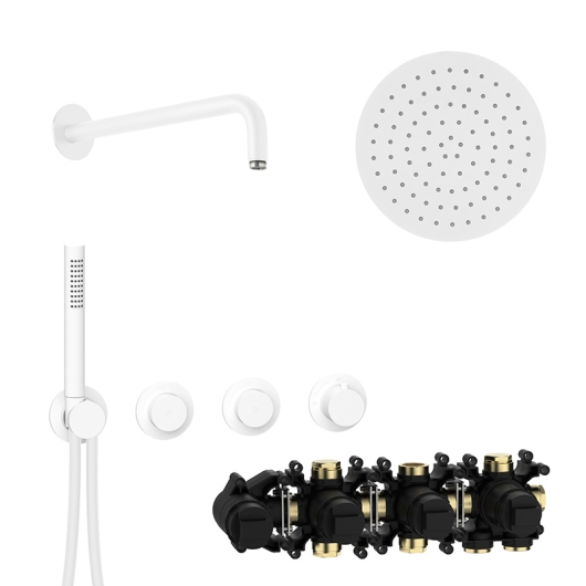 ![]() | 70.702713.1.07 MODUL7 PUSH-Thermostat-Set P-RB250 mit Regenbrause und Stabhandbrause 70.720003.1.09 MODUL7 PUSH-Thermostat-Einbaukörper - für 2 Verbraucher - Einbautoleranz 77 - 97 mm 70.702003.1.07 MODUL7 PUSH-Thermostat-Farbset für 2 Verbraucher - drehbare Thermostatkartusche zur Regelung des Temperaturbereichs von 20°C-55°C - manuell entriegelbare Heißwassersperre bei 38°C als Verbrühschutz - Start + Stop des Wasserflusses durch drücken der PUSH Mengenventile - leichtgängige und stufenlose Mengenregulierung mit komfortablem 90° Bedienradius - Brauseanschlussbogen mit verdecktem Schlauchanschluss - MODUL7-Brauseschlauch 1500 mm mit Drehkonus - 1-strahlige Messing-Stabhandbrause - Messing Bediengriffe - Messing Modulblenden Ø 70 mm 23.960350.1.07 LIVING SPA Wandarm 350 mm - Messingblende Ø 70 mm 23.600250.1.07 LIVING SPA Slim-Regenbrause Ø 250 mm - mit Clean-Effect Oberfläche Weiß matt UVP 2.575,00 € zzgl. MwSt.