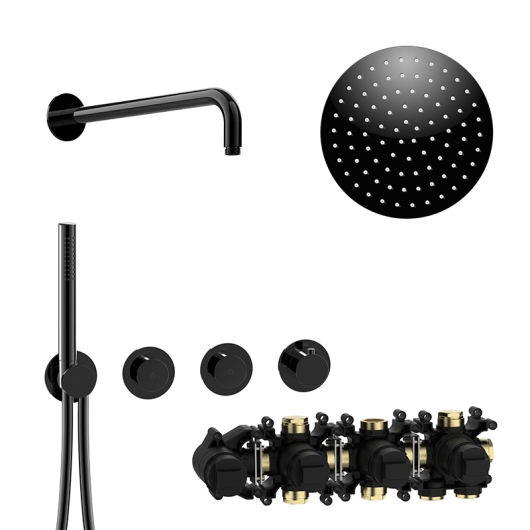 ![]() | 70.702713.1.08 MODUL7 PUSH-Thermostat-Set P-RB250 mit Regenbrause und Stabhandbrause 70.720003.1.09 MODUL7 PUSH-Thermostat-Einbaukörper - für 2 Verbraucher - Einbautoleranz 77 - 97 mm 70.702003.1.08 MODUL7 PUSH-Thermostat-Farbset für 2 Verbraucher - drehbare Thermostatkartusche zur Regelung des Temperaturbereichs von 20°C-55°C - manuell entriegelbare Heißwassersperre bei 38°C als Verbrühschutz - Start + Stop des Wasserflusses durch drücken der PUSH Mengenventile - leichtgängige und stufenlose Mengenregulierung mit komfortablem 90° Bedienradius - Brauseanschlussbogen mit verdecktem Schlauchanschluss - MODUL7-Brauseschlauch 1500 mm mit Drehkonus - 1-strahlige Messing-Stabhandbrause - Messing Bediengriffe - Messing Modulblenden Ø 70 mm 11.960350.1.08 LIVING SPA Wandarm 350 mm - Messingblende Ø 70 mm 11.600250.1.08 LIVING SPA Slim-Regenbrause Ø 250 mm - mit Clean-Effect Oberfläche PVD Absolute Black UVP 2.627,00 € zzgl. MwSt.