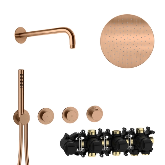 ![]() | 70.702713.1.39 MODUL7 PUSH-Thermostat-Set P-RB250 mit Regenbrause und Stabhandbrause 70.720003.1.09 MODUL7 PUSH-Thermostat-Einbaukörper - für 2 Verbraucher - Einbautoleranz 77 - 97 mm 70.702003.1.39 MODUL7 PUSH-Thermostat-Farbset für 2 Verbraucher - drehbare Thermostatkartusche zur Regelung des Temperaturbereichs von 20°C-55°C - manuell entriegelbare Heißwassersperre bei 38°C als Verbrühschutz - Start + Stop des Wasserflusses durch drücken der PUSH Mengenventile - leichtgängige und stufenlose Mengenregulierung mit komfortablem 90° Bedienradius - Brauseanschlussbogen mit verdecktem Schlauchanschluss - MODUL7-Brauseschlauch 1500 mm mit Drehkonus - 1-strahlige Edelstahl-Stabhandbrause - Edelstahl Bediengriffe - Edelstahl Modulblenden Ø 70 mm 21.960350.1.39 LIVING SPA Wandarm 350 mm - Edelstahlblende Ø 70 mm 11.600250.1.39 LIVING SPA Regenbrause Ø 250 mm - mit Clean-Effect Oberfläche PVD Copper Steel UVP 3.790,00 € zzgl. MwSt.