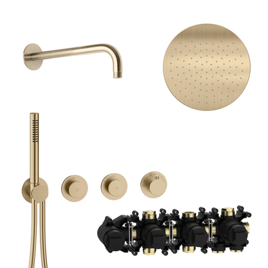 ![]() | 70.702713.1.41 MODUL7 PUSH-Thermostat-Set P-RB250 mit Regenbrause und Stabhandbrause 70.720003.1.09 MODUL7 PUSH-Thermostat-Einbaukörper - für 2 Verbraucher - Einbautoleranz 77 - 97 mm 70.702003.1.41 MODUL7 PUSH-Thermostat-Farbset für 2 Verbraucher - drehbare Thermostatkartusche zur Regelung des Temperaturbereichs von 20°C-55°C - manuell entriegelbare Heißwassersperre bei 38°C als Verbrühschutz - Start + Stop des Wasserflusses durch drücken der PUSH Mengenventile - leichtgängige und stufenlose Mengenregulierung mit komfortablem 90° Bedienradius - Brauseanschlussbogen mit verdecktem Schlauchanschluss - MODUL7-Brauseschlauch 1500 mm mit Drehkonus - 1-strahlige Edelstahl-Stabhandbrause - Edelstahl Bediengriffe - Edelstahl Modulblenden Ø 70 mm 21.960350.1.41 LIVING SPA Wandarm 350 mm - Edelstahlblende Ø 70 mm 11.600250.1.41 LIVING SPA Regenbrause Ø 250 mm - mit Clean-Effect Oberfläche PVD Brass Steel UVP 3.790,00 € zzgl. MwSt.