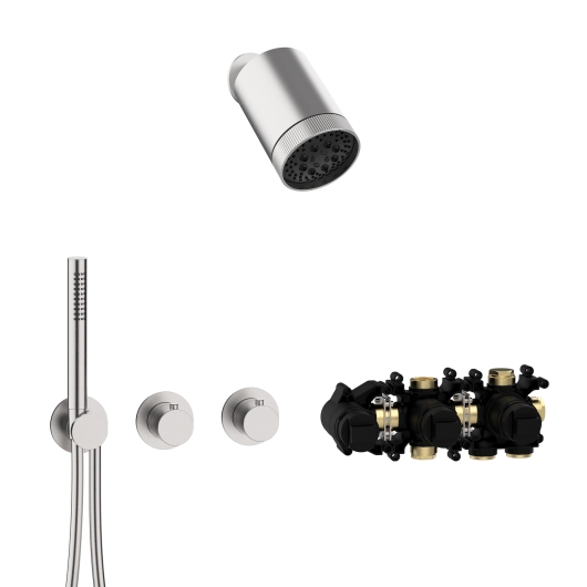 ![]() | 70.702721.1.09 MODUL7 Thermostat-Set T-SP3 mit SPOT Multi und Stabhandbrause 70.720001.1.09 MODUL7 Thermostat-Einbaukörper _für 2 Verbraucher _Einbautoleranz 60 - 90 mm 70.702001.1.09 MODUL7 Thermostat-Farbset für 2 Verbraucher _drehbare Thermostatkartusche zur Regelung des Temperaturbereichs von 20°C-55°C _manuell entriegelbare Heißwassersperre bei 38°C als Verbrühschutz _keramischer 2 Wege-Umsteller _leichtgängige und stufenlose Mengenregulierung mit geringem Bedienradius _Brauseanschlussbogen mit verdecktem Schlauchanschluss _MODUL7-Brauseschlauch 1500 mm mit Drehkonus _1-strahlige Edelstahl-Stabhandbrause _Edelstahl Bediengriffe _Edelstahl Modulblenden Ø 70 mm 11.044286.1.09 LIVING SPA Wand-Regenbrause SPOT 102x142mm Multi _Strahlarten: Regen / Regen soft / Massage _mit Clean-Effect Oberfläche Edelstahl matt gebürstet UVP 2.884,00 € zzgl. MwSt.