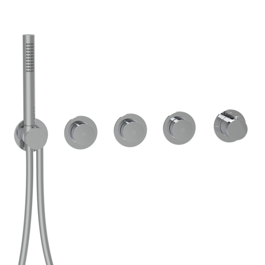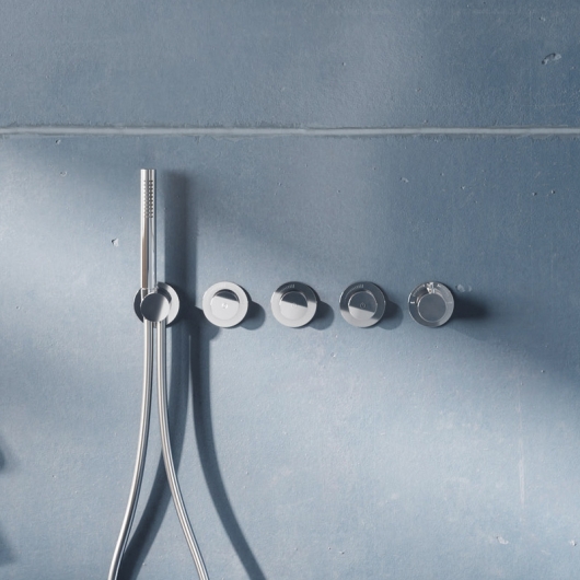 ![]() | 70.703003.1.01 MODUL7 PUSH Thermostat für 3 Verbraucher mit Stabhandbrause bestehend aus: Thermostat, 3 PUSH Mengenventilen, Brausehalterset LOGIC-Thermostatkartusche Heißwassersperre 38°C Start + Stop des Wasserflusses durch drücken der PUSH Mengenventile stufenlose Mengenregulierung MODUL7 Brauseschlauch 1500 mm mit Drehkonus Messing Stabhandbrause mit Clean-Effect Messing Bediengriffe Messing Modulblenden Ø 70 mm eigensicher gegen Rückfließen Oberfläche Chrom UVP 664,00 € zzgl. MwSt.