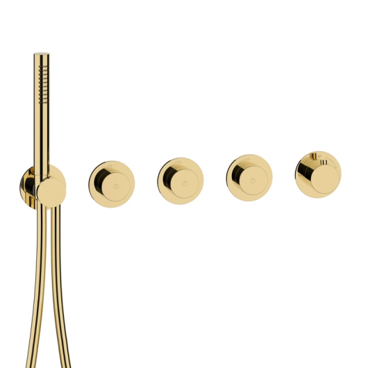 ![]() | 70.703003.1.03 MODUL7 PUSH Thermostat für 3 Verbraucher mit Stabhandbrause bestehend aus: Thermostat, 3 PUSH Mengenventilen, Brausehalterset LOGIC-Thermostatkartusche Heißwassersperre 38°C Start + Stop des Wasserflusses durch drücken der PUSH Mengenventile stufenlose Mengenregulierung MODUL7 Brauseschlauch 1500 mm mit Drehkonus Messing Stabhandbrause mit Clean-Effect Messing Bediengriffe Messing Modulblenden Ø 70 mm eigensicher gegen Rückfließen Oberfläche PVD Gold UVP 999,00 € zzgl. MwSt.